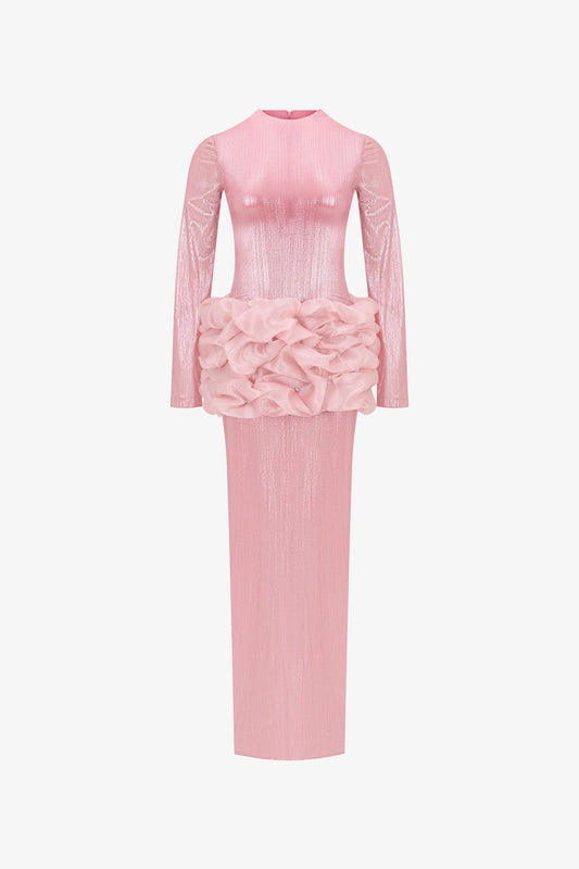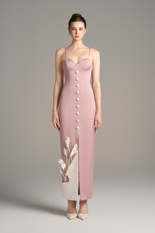 فستان ماكسي ضيق بتصميم مزدوج مع رقبة على شكل حرف V ومزين باللون الأوركيد
