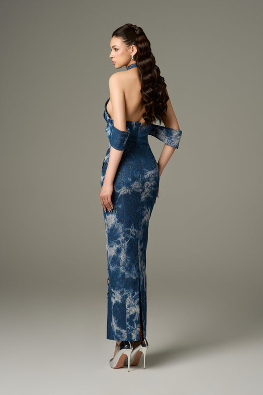 فستان ماكسي أنيق ومحتشم من قماش الدنيم القطني بتصميم هالتر وصبغة التعادل