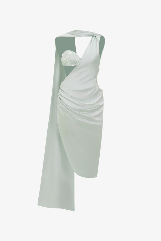 فستان حريري متوسط الطول بفتحة عند الخصر مع زينة من اللؤلؤ