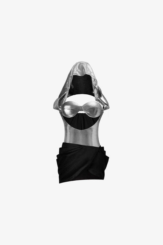فستان قصير بتصميم فني مستقبلي باللونين الأبيض والأسود مع كشكشة