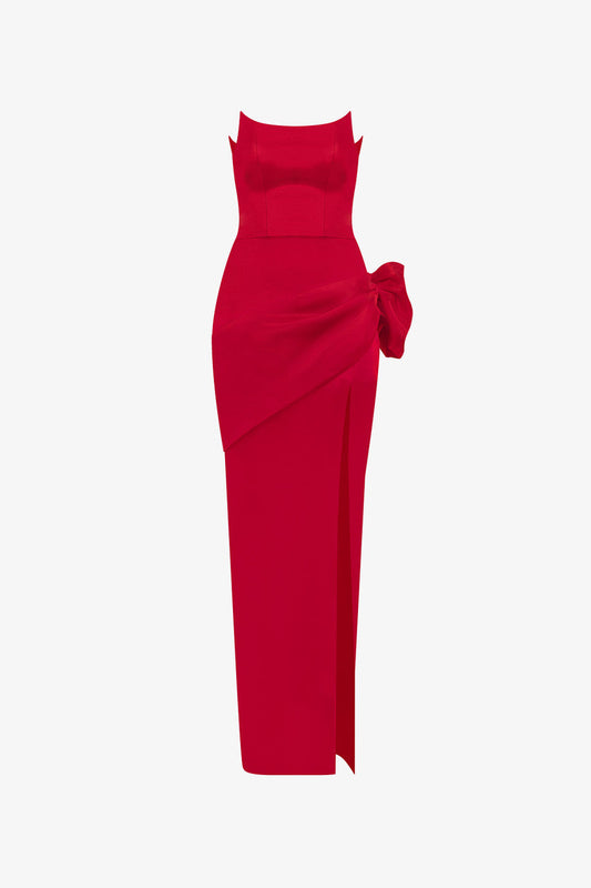 فستان حريري رائع مكشوف الكتفين مع فيونكة درامية