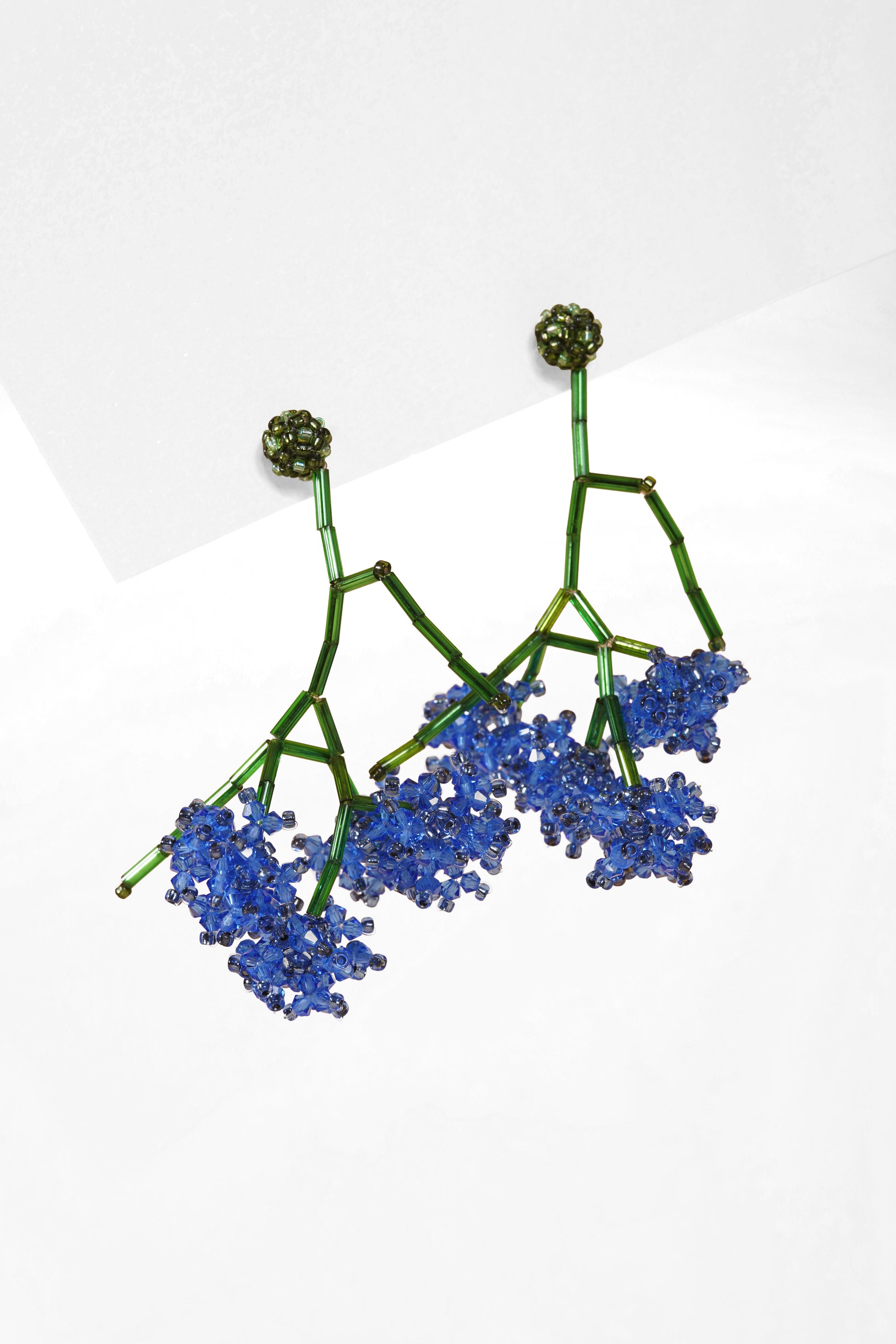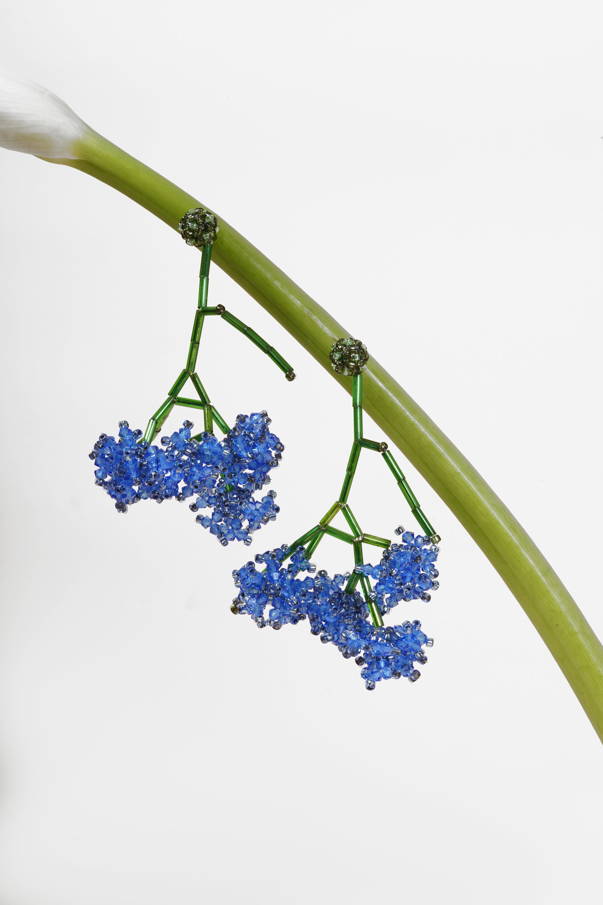 أقراط الكوبية تُجسّد فنًا زهريًا أنيقًا. كل زوج مصنوع يدويًا بدقة متناهية باستخدام أكثر من 280 بلورة سواروفسكي وخرز زجاجي ياباني، مُرتبة على شكل عناقيد الكوبية المتفتحة على سيقان خضراء زاهية.