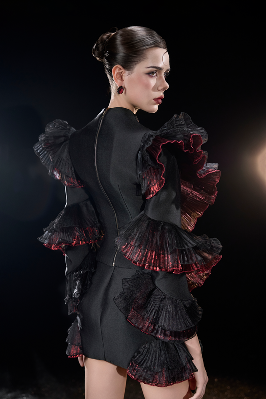 Gothic Futuristic Dramatic Ruffled Long Puff Sleeves And Mini Dress Set