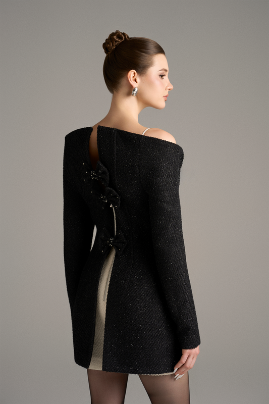 Stellar Black & White Long Sleeves Bow Embellished Mini Dress