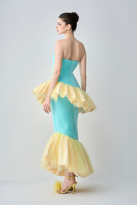 Snow-whisper Bandeau Corset Maxi Dress With 3D Petal Layers