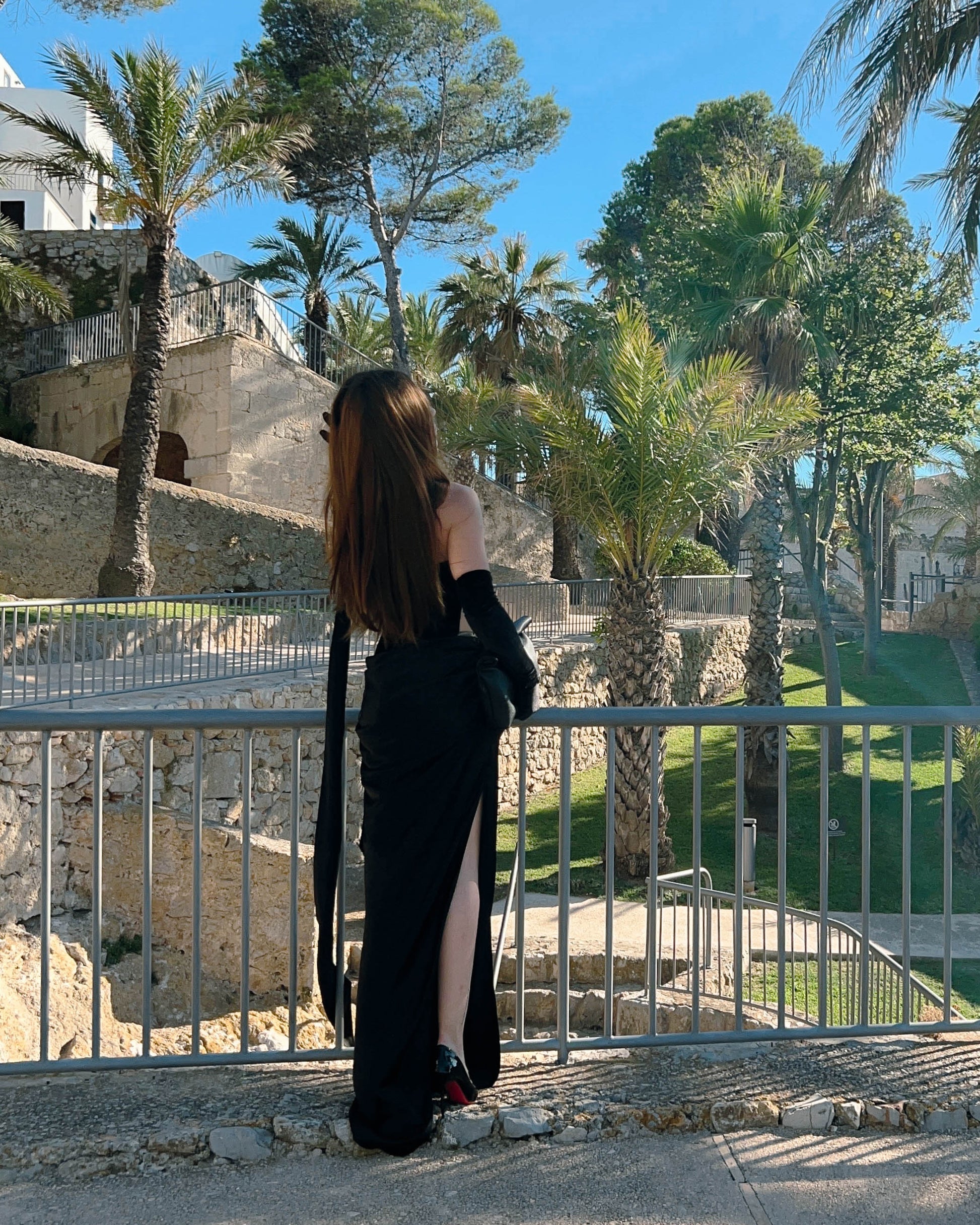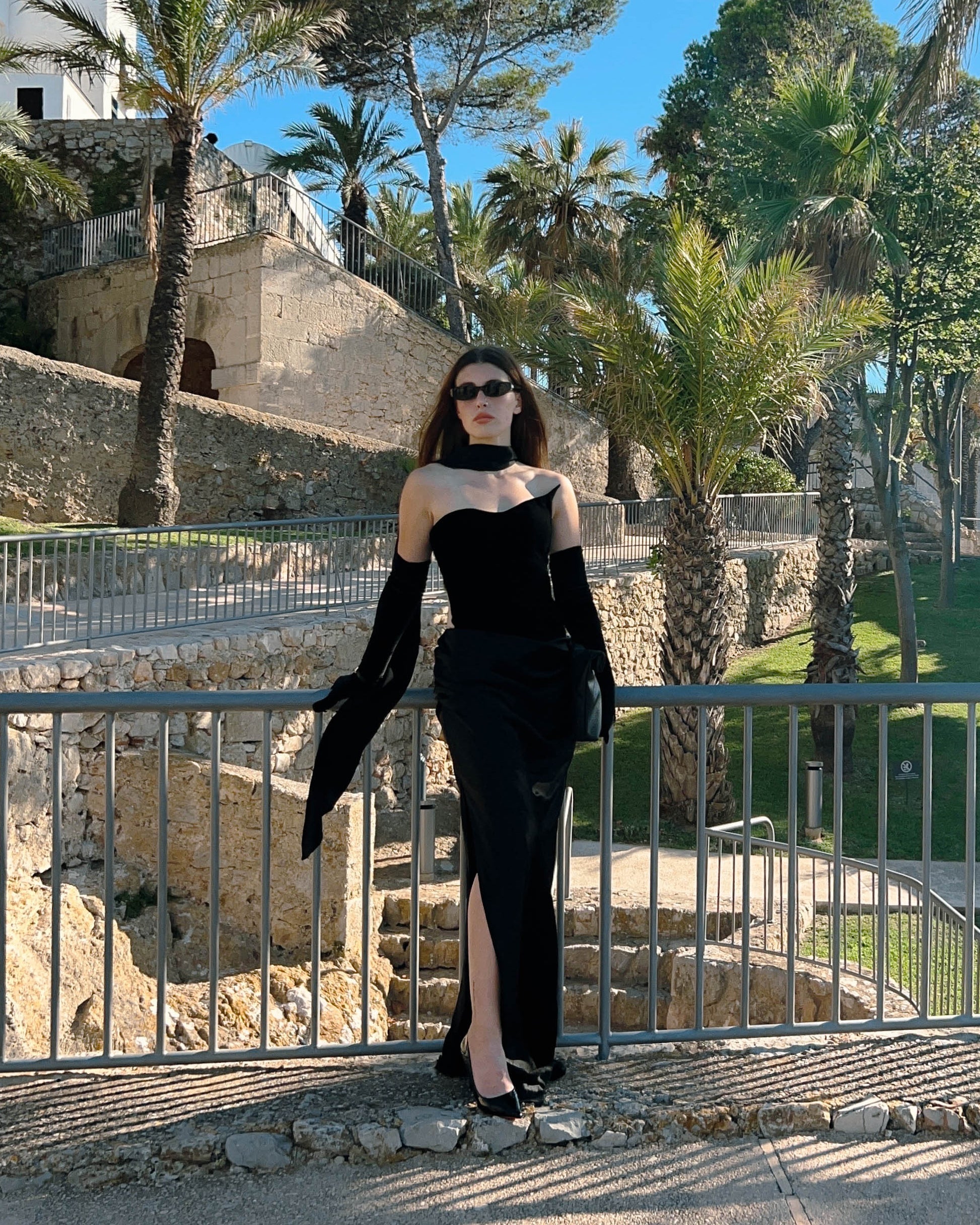 Crafted with a flowing silk skirt, matching opera gloves, and a scarf, this look blends old-Hollywood glamour with modern elegance.