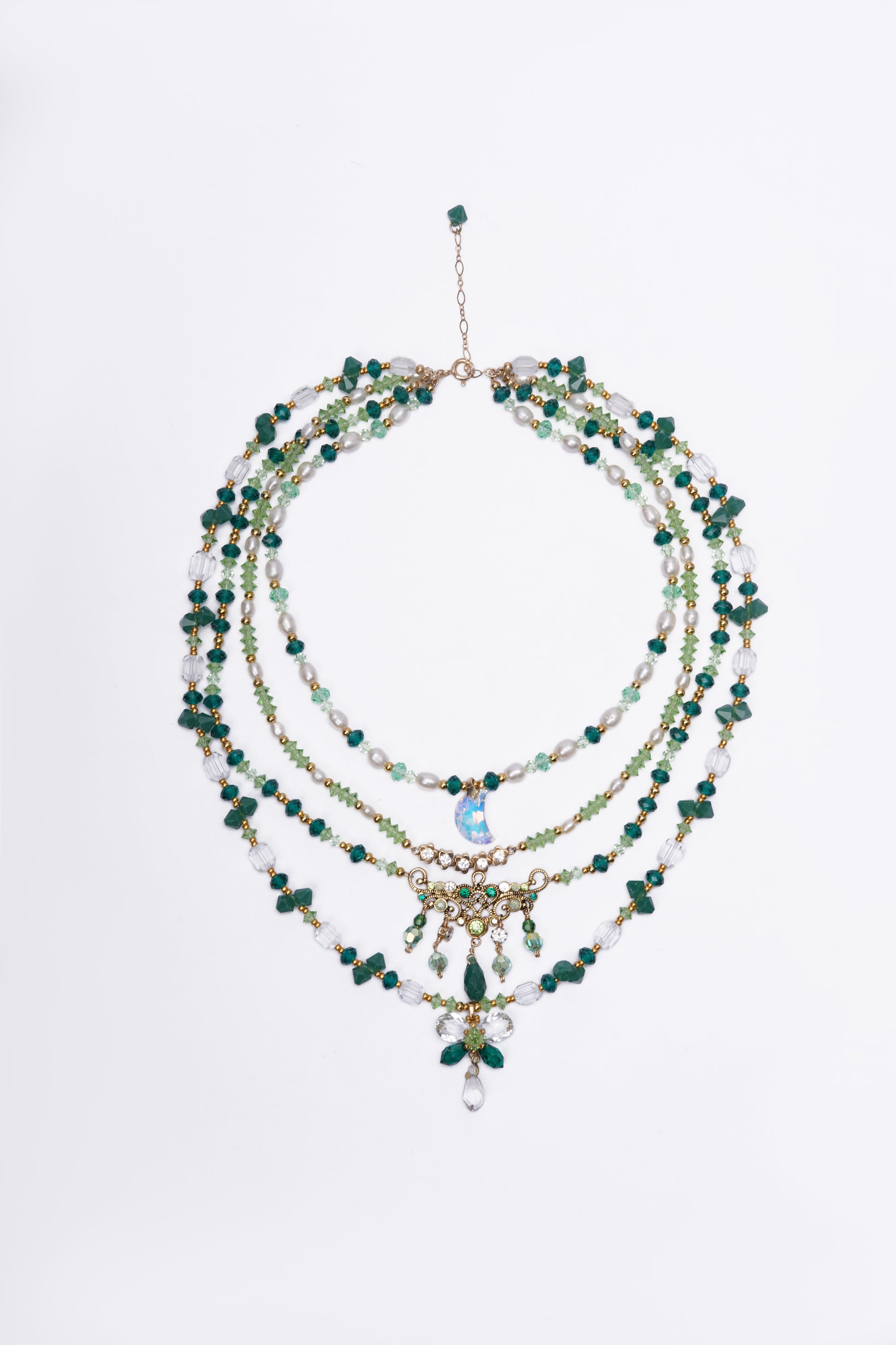 Elevate your look with the Moonlit Necklace, a statement multi-strand piece handcrafted with over 300 meticulously arranged Swarovski crystals, freshwater pearls, and floral charms.