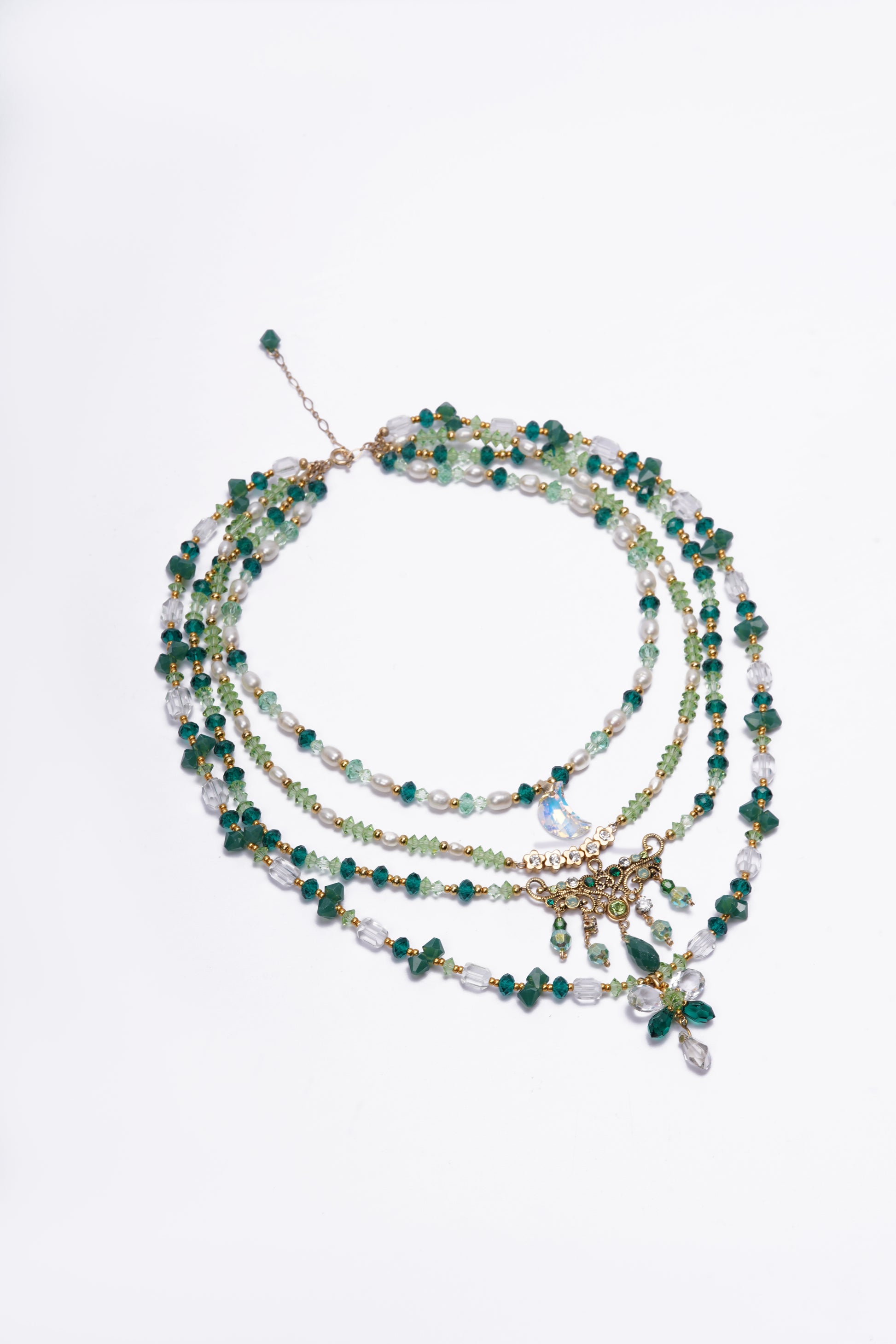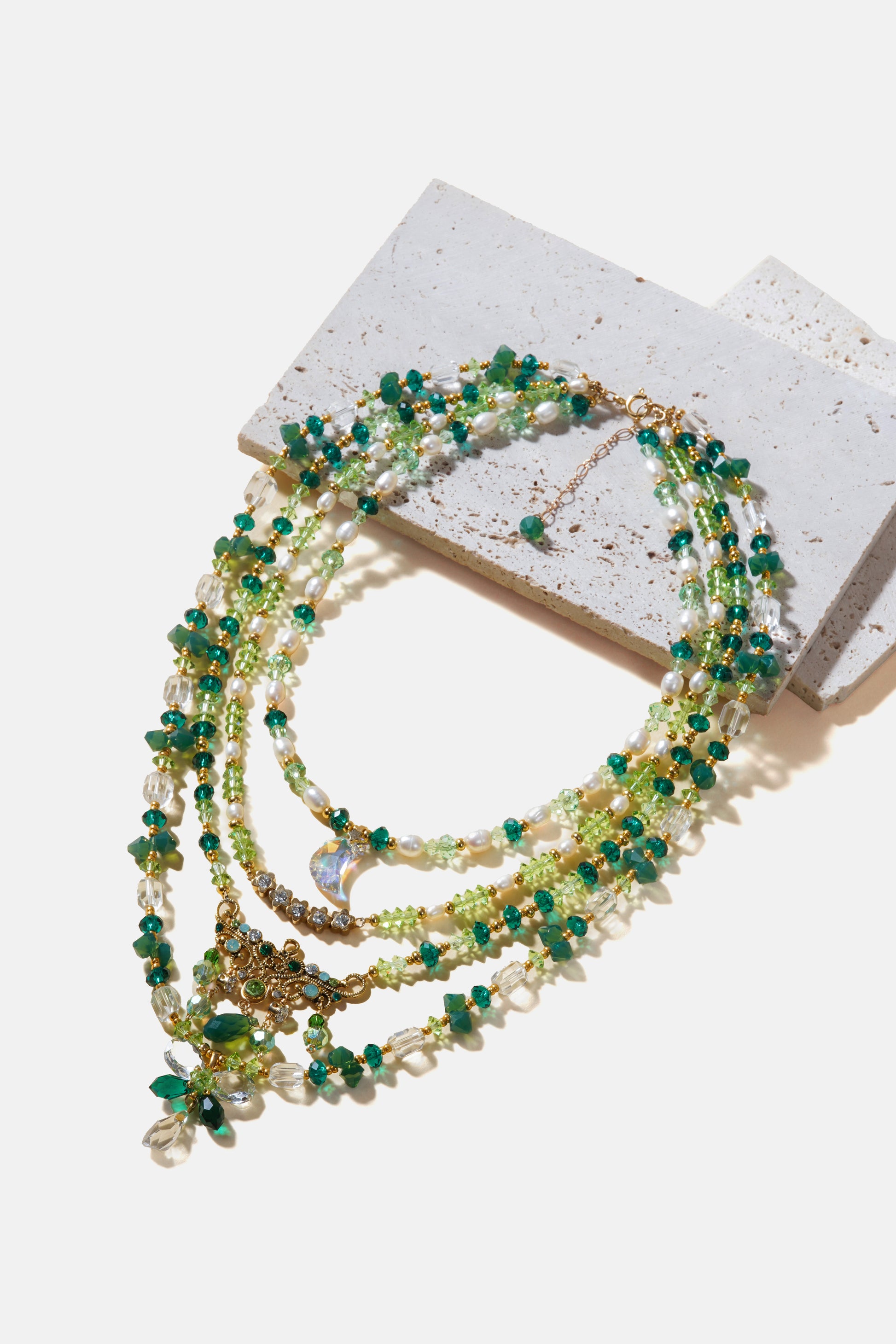 At its heart, a shimmering crescent moon pendant and a butterfly drop centerpiece evoke the enchantment of a starlit garden, while green crystal beads and golden accents add depth and richness to the layered design.