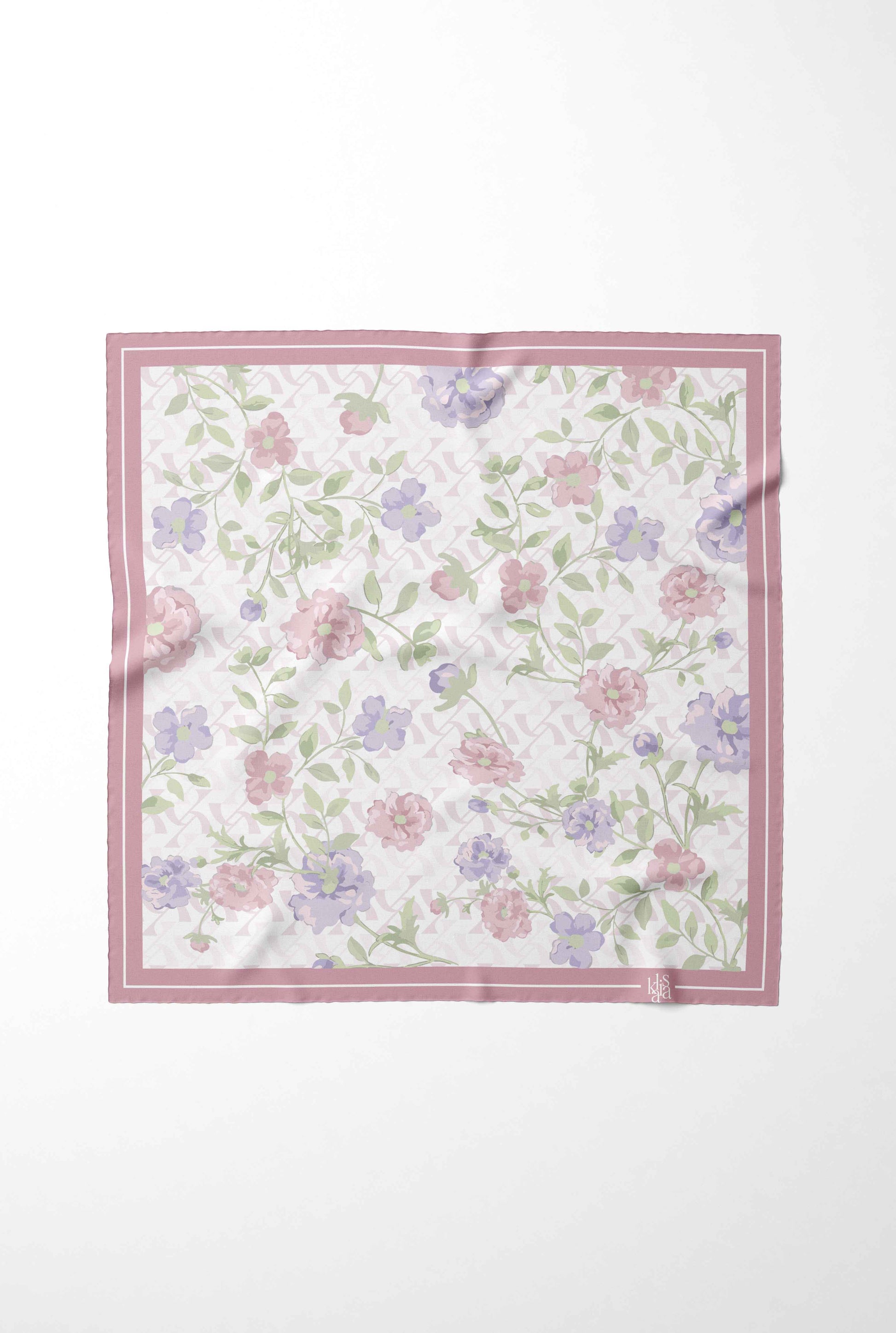 This luxurious Lavender silk scarf features a soft pink lavender hue, adorned with a stunning floral bloom that dances around the edges. The delicate flowers in shades of pink and purple create a vibrant yet graceful contrast, making this scarf a perfect accessory to add a touch of romantic elegance to any ensemble.