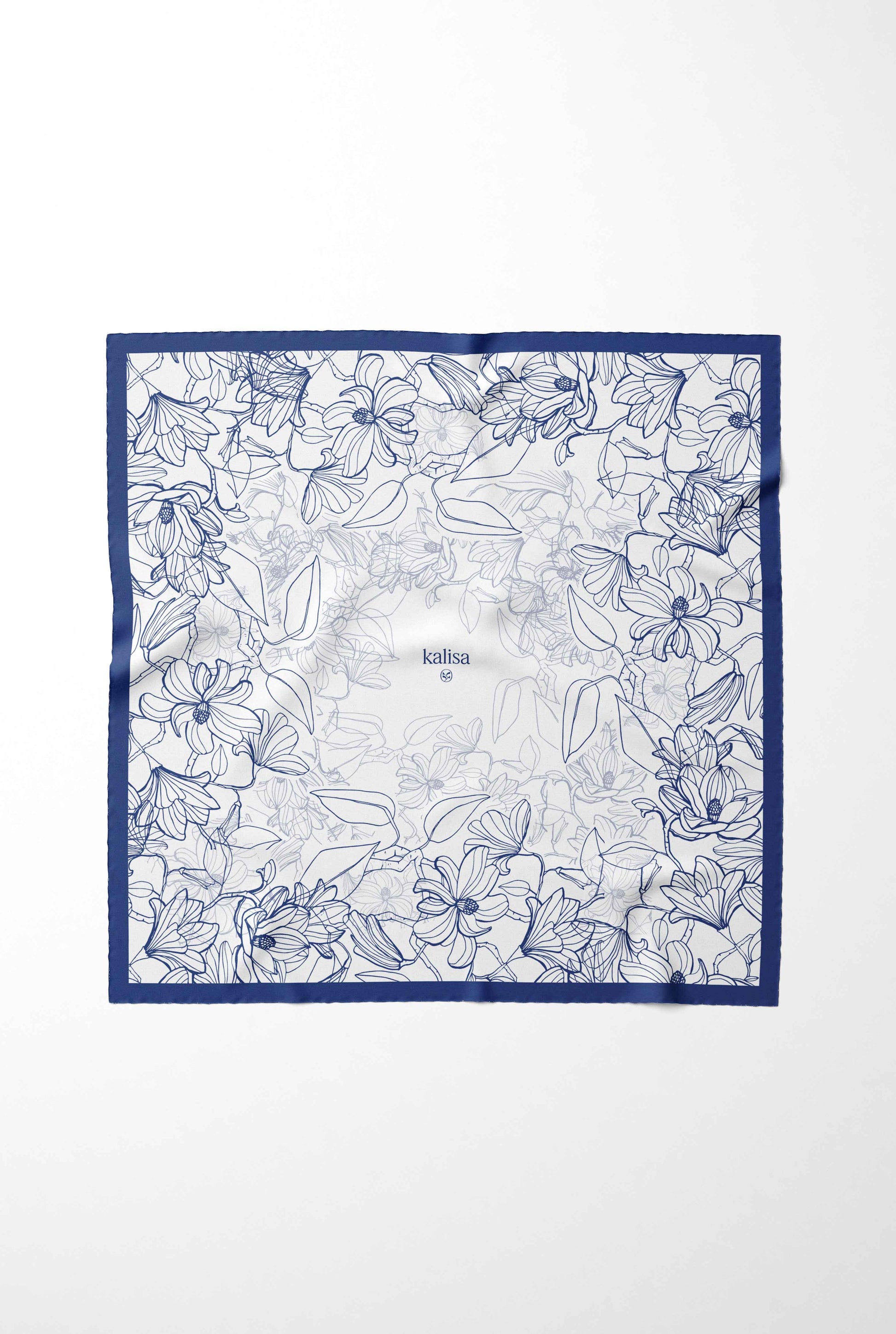This exquisite Midnight silk scarf features a mesmerizing "midlife blue" backdrop adorned with delicate flowers and leaves that gracefully fade toward the center, creating a captivating ombre effect. The rich blue tones, paired with the intricate floral design, evoke a serene midnight garden, offering a luxurious and elegant addition to any outfit.