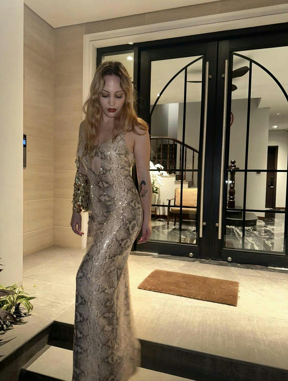 The snakeskin-inspired sequin print adds a layer of luxury. Idea for cocktail parties, red carpet events, formal evenings, and celebrations.