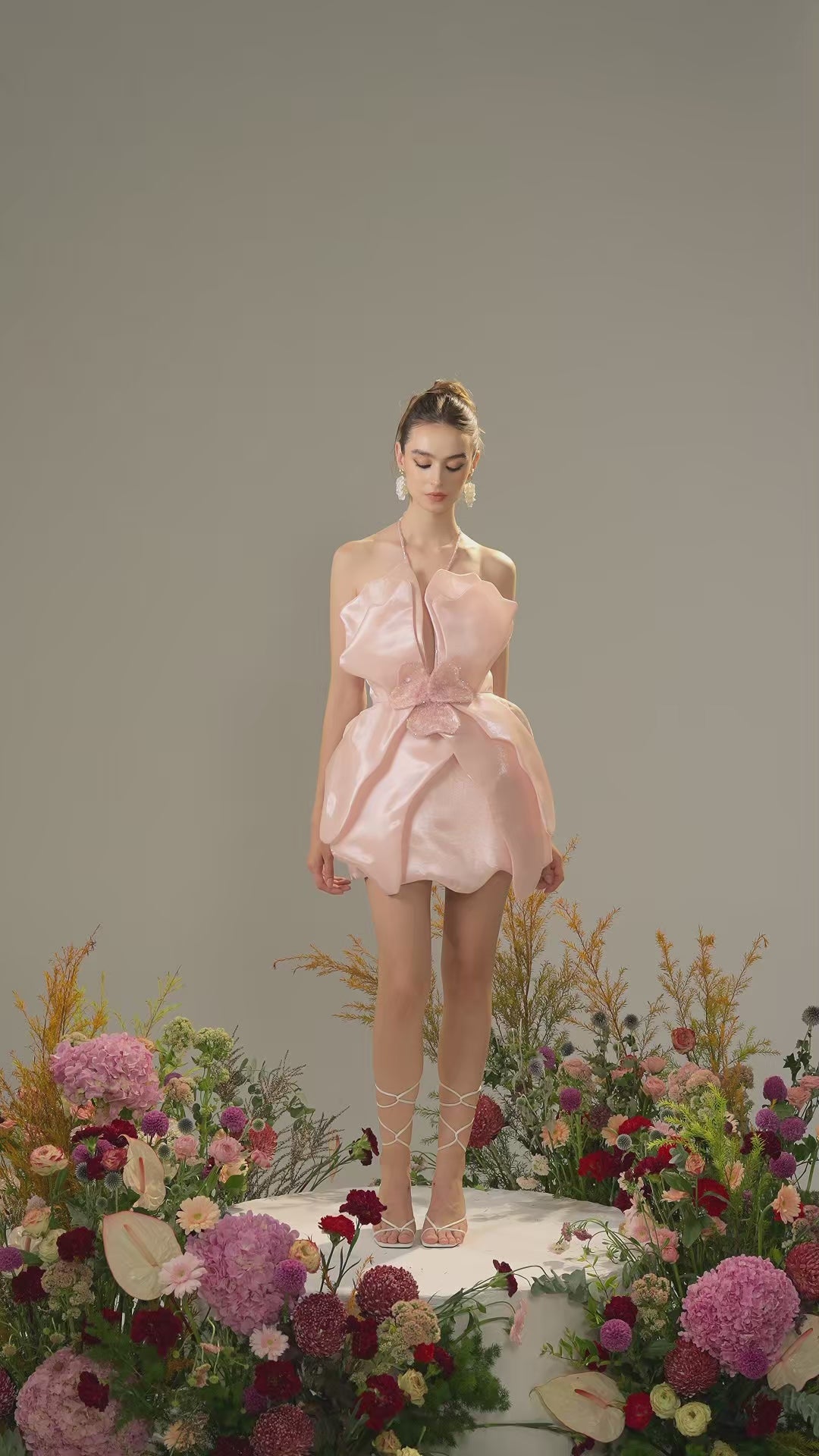 High-end stone embellishments sparkle with each step, while sculptural cutouts, inspired by orchid petals, contour the body in a truly artistic way. The string halter neckline adds a refined, sensual touch, perfectly balancing delicacy and allure.