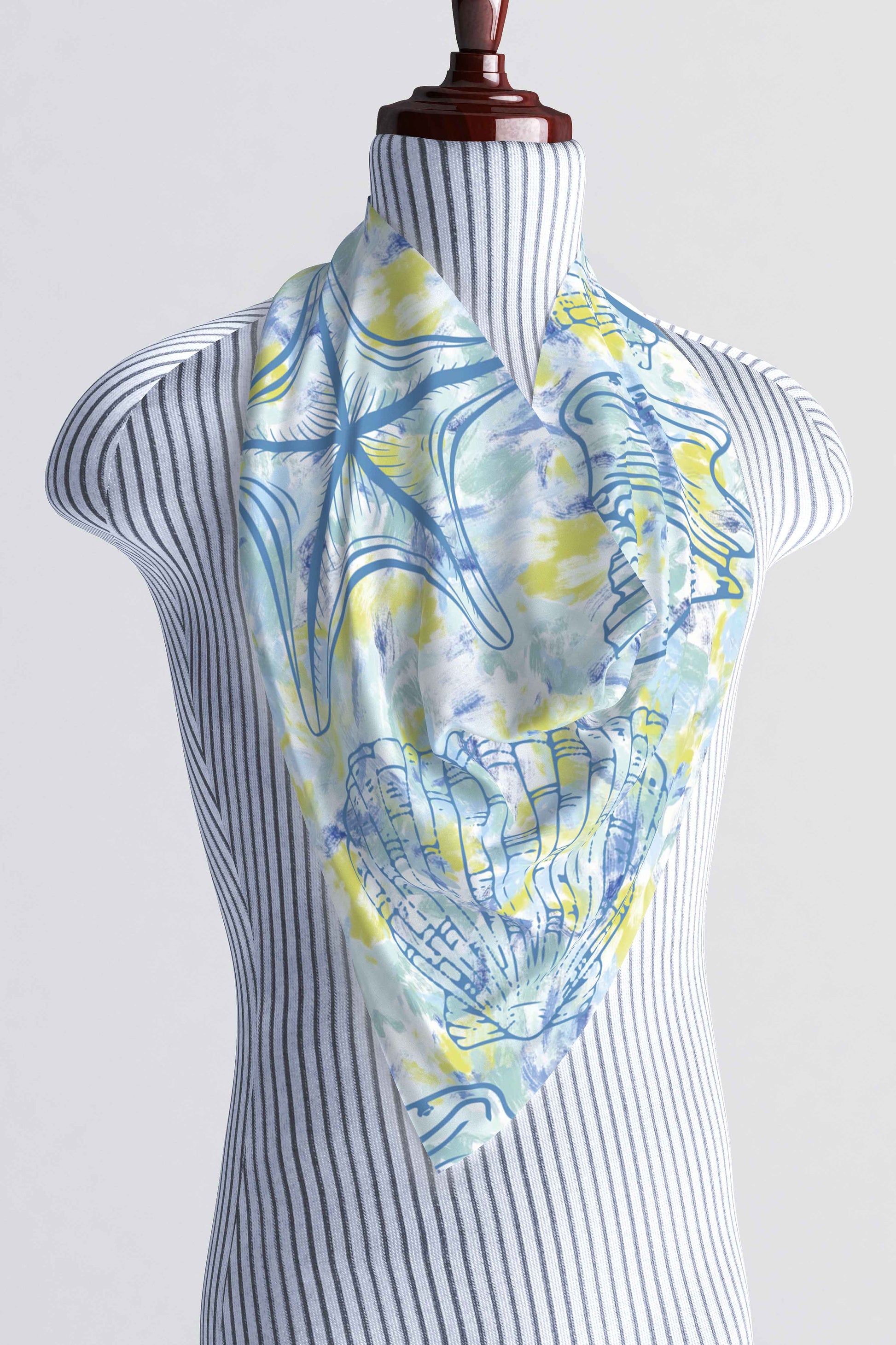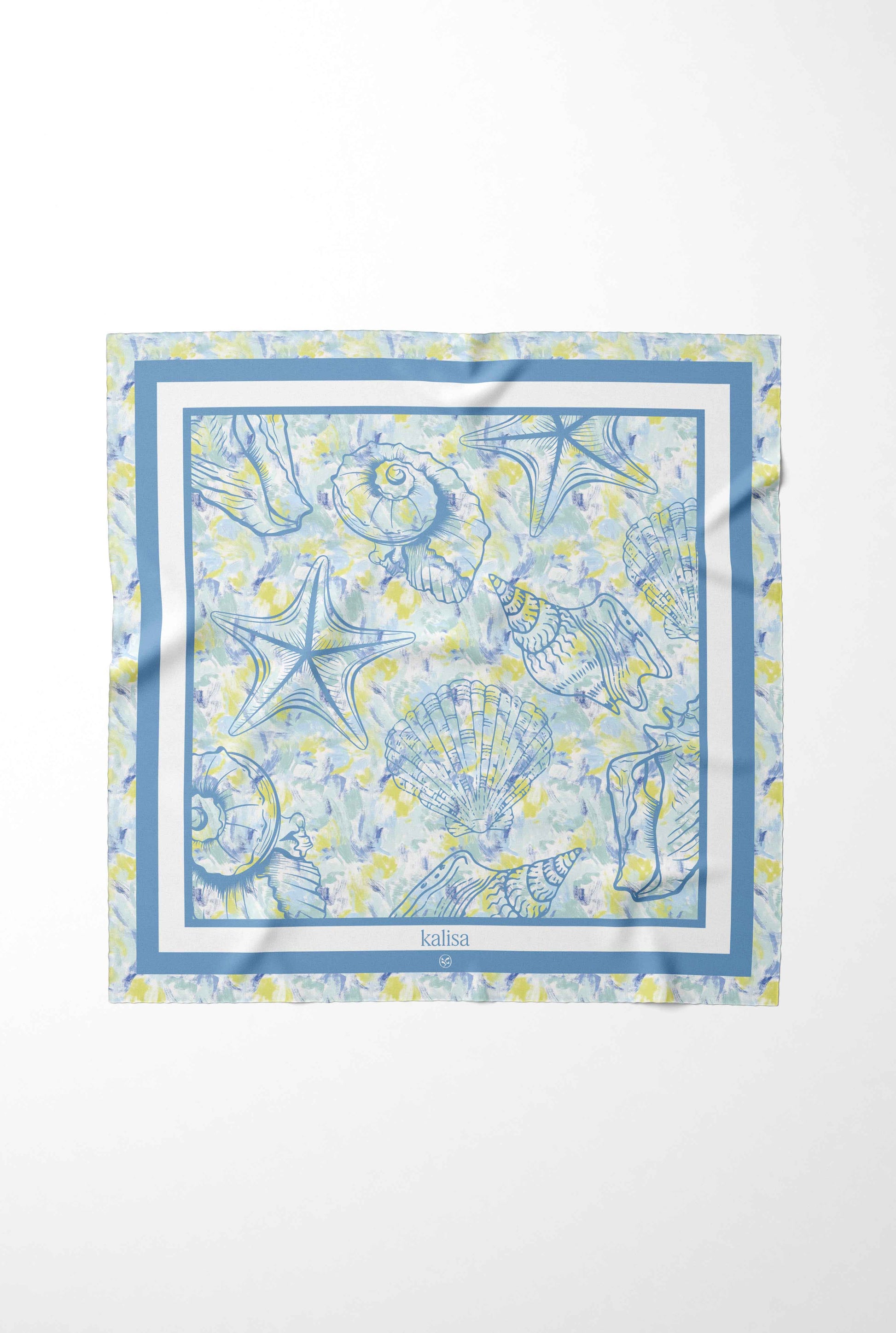This stunning Seafoam silk scarf showcases a soft seafoam mist blue hue, printed with an intricate pattern of seashells and starfish that evoke the beauty of the ocean. The delicate, flowing design captures the essence of a serene seaside, blending luxurious craftsmanship with a natural elegance that enhances any outfit with a touch of coastal charm.