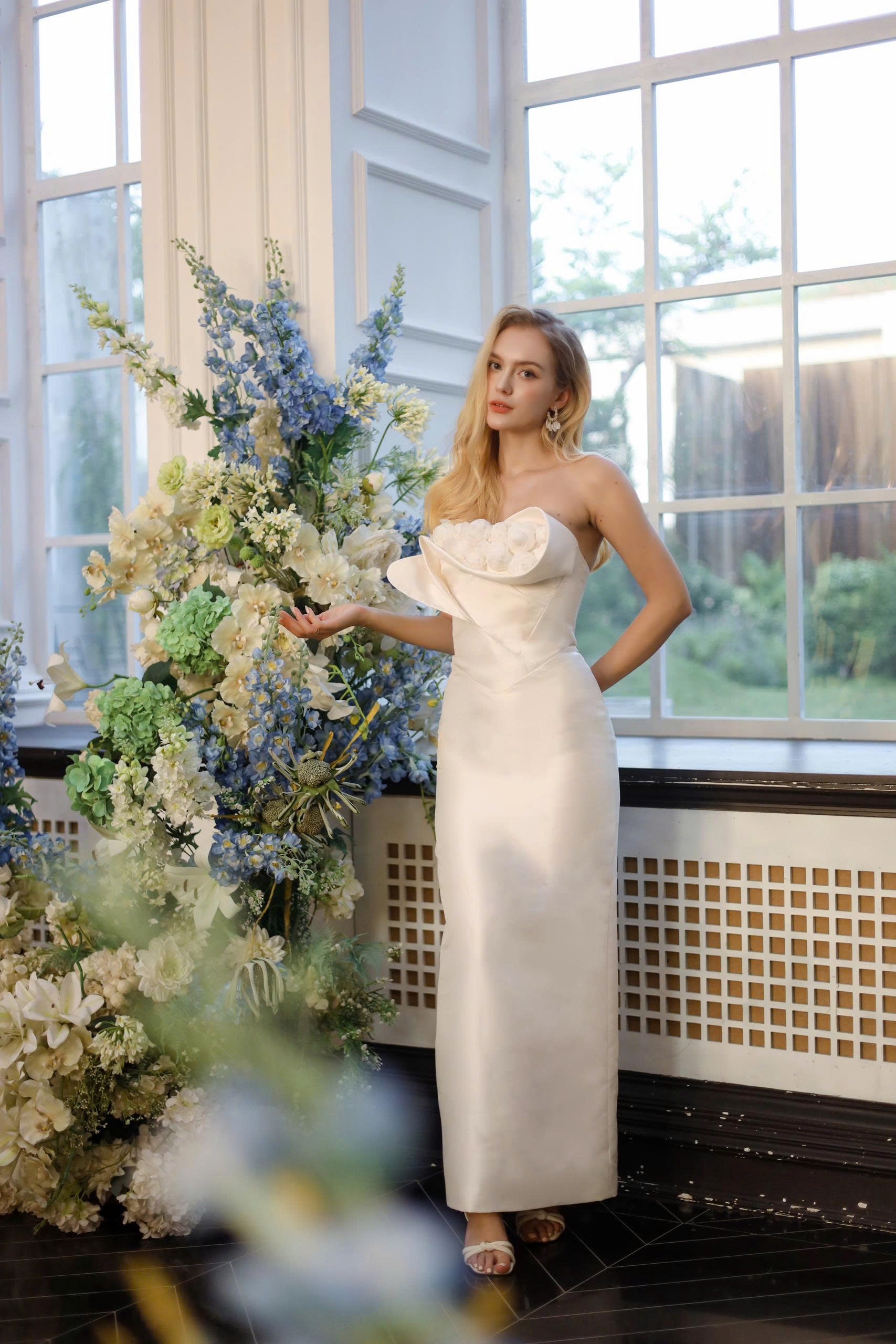 The SERAPHINE strapless masterpiece is tailored to perfection, featuring a sharp V-shaped waist that elongates and flatters the silhouette. This design features a sculptural, asymmetrical neckline with a draped overlay that mimics the natural fold of a petal.
